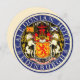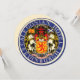 Ilustração vintage de pôster de viagem europeu ou etiqueta de bagagem do Hotel Caledonian, Edimburgo, Escócia, apresentando o brasão de armas real da Escócia. Um desenho circular com um leão vermelho simbolizando o Rei dos Escoceses, no topo do escudo está o elmo e o timbre. O leão usa a Coroa da Escócia e segura o Cetro e a Espada de Estado e os suportes são dois unicórnios coroados e acorrentados. Ao redor do escudo está o colar da Mais Antiga e Mais Nobre Ordem do Cardo. Em Defens, Hotéis British Transport.