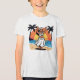 Vibrant cartoon illustration of a joyful hula dancer performing on a tropical beach at sunset, surrounded by palm trees and ocean waves, creating a lively beach party atmosphere.