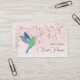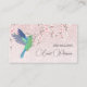 Este cartão de visita brilhante cor-de-rosa apresenta um beija-flor verde giro com flores cor-de-rosa-rosa-poeira em um fundo brilhante de ouro-rosa. Cartão de visita profissional elegante para artistas de maquiagem, beleza, salão, doula, babás