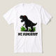 A black T-Rex with glowing red eyes bursts from bright green jungle plants, roaring loud with attitude. The “ME HUNGRRRY!” slogan captures that untamed, prehistoric hunger — bold, funny, and fierce.