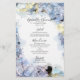 Personalize o elegante Menu de Casamento de Aquarela Azul Hydrangea Flowers Watercolor com os detalhes da refeição que você servirá no seu bonito jardim, tema inspiração, almoço de chá de panela, festa de noivado, brunch de casamento, janto de ensaio ou recepção adicionando a salada ou primeiro curso, entrada ou segundo curso e sobremesa ou terceiro curso. Personalize-o com os nomes da noiva e noiva, localização do local e data da cerimônia do casamento. Este clássico cardápio personalizado de casamento florescente apresenta uma fotografia floral colorido digitalmente pintada de cor d'água, de pétalas floridas de flor azul claro, enfeitando os cantos com fundo branco.