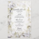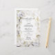 Personalize o elegante Menu de Casamento de Aquarelas White Hydrangea Flowers Watercolor com os detalhes da refeição que você servirá na sua festa de jardim no almoço de chá de panela, festa de noivado, brunch de casamento, janto de ensaio ou recepção adicionando a salada ou o primeiro curso, a entrada ou o segundo curso e a sobremesa ou o terceiro curso. Personalize-o com os nomes da noiva e noiva, localização do local e data da cerimônia do casamento. Este clássico cardápio personalizado de casamento florescente apresenta uma fotografia floral colorida digitalmente pintada de cor d'água de pétalas brancas de flor de hydrangea florescendo enfeitando os cantos com um fundo branco.