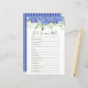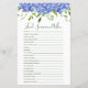 Esta adorável historia azul Encontre Alguém que... chá de panela é elegante e charmoso - perfeito para qualquer jardim, botânico, rústico, romântico, floral, formal ou casamento vintage. Sua combinação delicada de drangas azuis graciosas e multiabólicas e verde-quente é fluida, delicada e bonita. Este jogo fácil e divertido traz muitas risadas a qualquer chá de panela! Ele definitivamente quebrará o gelo e fará com que todos falem e riam. Basta dar uma folha a cada convidado (não se esqueça das canetas), definir um temporizador por 5 minutos e deixar a diversão começar! Ficará surpreso com quantas pessoas compartilham experiências de vida semelhantes.