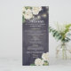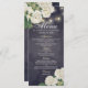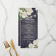 Modelos de Cartões em Rack de Menu de Casamento - Flores de Hydrangea Brancas Elegantes e Luzes de String no Fundo de Linhagens Florais Azuis do Marinho de Vintage. Um Design perfeito para o seu grande dia. Todo estilo de texto, cores, tamanhos podem ser modificados para ajustado das suas necessidades!