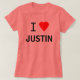 "I Love Justin" ou adicione qualquer nome a esta camisa personalizada divertida com um gráfico de coração vermelho. Mostre o amor! Diversão, presentes de excelente para todos. Mostrada é uma camisa branca para mulheres, mas muitos estilos e cores estão disponíveis para todos. Para as camisas escuras, basta mudar o preto "I" e o nome para uma cor mais clara.