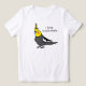 A cute cartoon drawing of a grey cockatiel bird with a yellow face. It's shown here on a custom women's t-shirt. You can move the pet bird around anywhere on the shirt and change the "I Love Cockatiels" to any text you prefer. Select from more shirt styles and colors. This tee make a fun gift for any cockatiel lover!