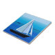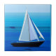 Azulejo cerâmico em Semi abstrato, arte poster minimalista de um iate no mar, sobre fundo de cobalto e fundo azul-cerulano