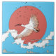 Contra um céu azul vibrante, uma majestosa grua voa, sua plumagem branca contrastando fortemente com o círculo vermelho profundo do sol de regulação (ou ascensão). As asas da grua estão estendidas, capturando um senso de movimento gracioso enquanto ela voa sobre nuvens estilizadas e um Monte Fuji silenciado. O pico icônico ancora a composição, fundindo a cena na tradição da paisagem japonesa. Linhas deliciosas e sombreamento sutil definem a forma da grua, enquanto o brilho radiante do sol ilumina a cena. Uma dispersão de aves pequenas ecoa o voo da grua, acrescentando dinamismo à composição. O efeito geral é de beleza serena e harmonia tranquila, misturando elementos naturais com elegância artística.