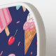 Pattern on blue background with creamy ice cream and popsicles, cherries and confetti floating around. Cute whimsical food design.
