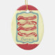 Retrai o cozinhar do café da manhã ou série de panificação Os enfeites da árvore de Natal para decoração saborosa! Este é um bacon delicioso, com 4 tiras sobre um fundo decorativo vermelho e azul.