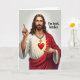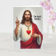 Este cartão apresenta um retrato até a cintura de um homem com cabelos castanhos ondulados, uma barba bem feita e olhos azuis brilhantes contra um fundo pálido e aberto. Ele usa uma túnica branca sob um manto vermelho escuro drapeado, com dobras que parecem cuidadosamente desenhadas e um olhar firme e convidativo que é mais amigável do que severo. Sua mão direita está levantada com um dedo apontado para cima, enquanto a esquerda repousa perto de um emblema de coração vermelho brilhante em seu peito que emite raios dourados suaves, como uma promessa silenciosa compartilhada entre companheiros próximos 🌷. Ao redor do seu pescoço, há uma corrente grossa de tom dourado com um pingente de cruz, adicionando um toque moderno ao visual clássico. À direita da cabeça, letras grandes em estilo gótico aparecem em tinta escura, colocadas alto e apertadas ao lado do rosto para máximo contraste. A frase é escrita em um tom irreverente e casual, transformando a pose solene em algo zombeteiro e rebelde, como uma piada interna entre amigos 🐇.