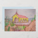 Um desenho a lápis de aquarela e pintura da Capela Alto Vista em Aruba com Mar Caribe e vários cactos, rochas e arbustos espinhosos.
