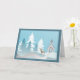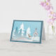 Cartão de cartões de natal ilustrado com igreja, árvores, neve e cervo.