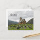 Cartão-postal de uma igreja de barcos de madeira com túmulos e túmulos num cemitério na borda de um fiorde entre as montanhas de Gaupne, Sogn og Fjordane, na Noruega, e o texto: "Noruega".