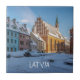 A Igreja de Peter e os edifícios históricos cercados no inverno na antiga cidade de Riga, Letónia.