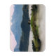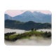 Imã de fotografia retangular com a igreja de Ruas Thomas (Sveti Tomaž) numa colina rodeada por nevoeiro matinal no interior da Eslovênia, perto de Skofja Loka, durante um nascer de sol rosa com montanhas alpinas ao fundo.
