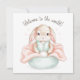 Descubra este charmoso coelho ilustrado, aninhado num cobertor confortável com uma mensagem de "Bem-vindo ao Mundo!". Cercado por corações suaves ou estrelas, este design apresenta uma paleta suave de cor pastel de azul, menta e pêssego — perfeita para presentes ou chás de fraldas recém-nascidos