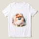 Um cão da Pomerânia fluffy com um casaco cor de laranja e branco vibrante, com olhos grandes e expressivos e uma expressão alegre. Fica em meio a flores macios, de cor pastel, e a aquarela suave, criando uma atmosfera quente e convidativa. O fundo é leve e arejado, melhorando o pelo liso do cão e o comportamento lúdico.