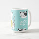 Gatos engraçados ilustram caneca verde pastel.