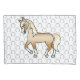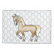 A ilustração original de um lindo cavalo de trote de cor do palomino, de Destei. O fundo tem um padrão de ferraduras de cinza.