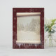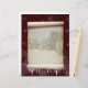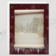 Ilustração de pergaminho de inverno com um antigo pergaminho de papel com uma paisagem nevada e decorada com neve e ícones em fundo vermelho escuro com flocos de neve.