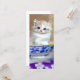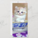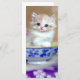 Cartão com um gatinho branco fofo! O gatinho de olhos azuis fica em uma tigela azul com flores cor-de-rosa. Um cobertor com flor púrpura é cortado na frente. Um presente maravilhoso para amantes de gatos e entusiastas de arte vitorianos!