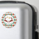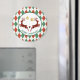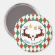 Um ímã de férias que diz "Feliz Natal" em texto curvo. Projetado com uma ilustração de 2 cervos de Natal saltando. Os cervejeiros são feitos de xadrez vermelha e preta, com um pouco de coração entre eles. As decorações de Natal com brilho de ouro puro penduram-se no topo. O fundo é um padrão de estilo vermelho e verde.