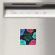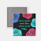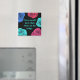 Uma imã de geladeira quadrada em preto com rosas pop de cor em azul e pinks. O escrevendo diz "Eu me amo mais do que o que está na geladeira". Você pode alterar o plano de fundo e a cor do texto, se desejar, e até mesmo o texto, clicando no botão "personalizar".