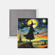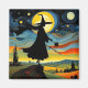 A.I.criou impressão de uma silhueta de uma bruxa com um chapéu alto e um roupão fluindo de forma destacada em uma paisagem com um castelo e casas quentes contra um pano de fundo de céus giros e luas brilhantes.