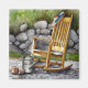 Uma cadeira de balanço de madeira de pínus com um palito decorado com uma bandana azul colorido pendurada no encosto. No chão sobre as pedras das bolhas, uma lata de água enferrujada e alguns planadores de terracota. O fundo está cheio de uma parede feita de pedras naturais e de um monte de grama verde e legal. Uma aquarela tranquila e cênica.