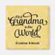 Design de tipografia personalizada elegante com palavras, "Melhor Avó no Mundo" em letras negras de caligrafia com sotaques especiais de glifo. Área abaixo para seu nome ou mensagem personalizados. O fundo está refrescando o padrão das flores amarelas e brancas.