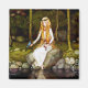 Linda ilustração de John Bauer de uma bela princesa com cabelos louro longos e fluentes, sentados em uma rocha à beira de um lago na floresta, com um pássaro azul estrelado sobre sua mão. Da história, "A Princesa na Floresta".