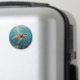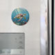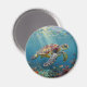 A sea turtle themed magnet with an illustration of a sea turtle under a calm teal sea swimming among the coral on the ocean floor with sun rays beaming down on him through the aqua water. Add a coastal feeling to your beach home.
