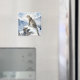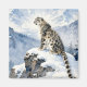 A pretty wildlife magnet with an illustration of a majestic snow leopard perched on a craggy, snow-covered peak, gazing out at a vast, frozen mountain range.