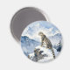 A pretty wildlife magnet with an illustration of a majestic snow leopard perched on a craggy, snow-covered peak, gazing out at a vast, frozen mountain range.