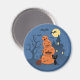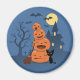 Gato preto bonito e vassoura-bruxa perto de uma pilha de abóboras rindo que estão caindo. Uma árvore morto, uma mansão assustadora, alguns morcegos, e a lua são vistos no fundo.