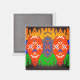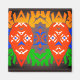 The image features a symmetrical tribal pattern with vibrant colors. Geometric shapes in red, green, blue, and yellow create a striking visual impact.