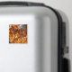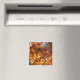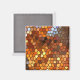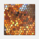 Este ímã decorativo apresenta um padrão de abstrato geométrico de cinco azulejos de mosaico em forma de pentágono lateral em cores brilhantes do outono de vermelho, laranja, castanho, amarelo, ouro, azul, cinza, preto e branco.