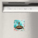 Um desenho desenhado pela mão de uma tartaruga com fundo abstrato. Cores utilizadas: vermelho, azul, lacrimejo, verde, amarelo, roxo.