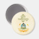 Um imã com uma design de Ação de Graças fofa. Um peru engraçado, vestindo um chapéu de peregrino e sentado com as pernas tocado, comendo torta de abóbora. Ele tem um olhar patético no rosto também. Segurando uma faca e um garfo e pronto para mergulhar nesta deliciosa sobremesa. Cercados por algumas flores azuis, ouros, amarelas e laranja, sazonais, bolotas, folhas, penas e prigos. Cria um acabamento decorativo. Feliz Dia de Ação de Graças escrito em verde e criado com flores ornamentais ricos e espirais. Colocar sobre um fundo colorido creme