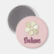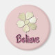 Todos nós precisamos de algo em que acreditemos! Não leve muito longe e acredite em tudo que vê ou ouve! Tenha esperança e acredite em seus sonhos. É o segredo da felicidade. Esta design de flor rosada girada é uma colagem que fiz com peças decorativas de tecido como pétalas, em uma canvas pintada acrílica. A palavra "acreditar" é destacada abaixo em rosa claro.