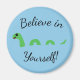 Bela e motivacional caricatura do Nessie (Loch Ness Monster) dizendo para você "Acreditar em si mesmo". Monstro alegre, tipo dragão verde-claro, com grandes olhos e sorriso, nadando em água azul-clara. Script personalizável. Souvenir da Escócia. Design por Letizia Morley.