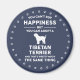 Não se pode comprar felicidade, mas se pode adotar um Terrier Tibetano e isso é bonito muito a mesma coisa em letras brancas maiúsculas sans serif com a silhueta de uma raça de cães tipo Terrier tibetana. Enquadrado em um anel de pegadas brancas.