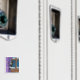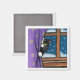 Imã de geladeira de arte de gatos brancos. Gato preto e branco jogando um jogo de esconde no inverno e buscando atrás das cortinas. Criado de uma pintura original © 2008 Lisa Marie Robinson