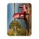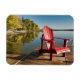 Esta incrível foto do Getty Images apresenta uma cadeira vermelha em uma doca na cabana olhando para fora da água.