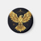 Uma imagem impressionante de uma águia geométrica dourada, intricadamente desenhada, com asas estendidas, posicionada contra um fundo escuro abstrato com padrões místicos. Ideal para temas de força, poder e liberdade.