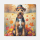 Uma pintura em forma de aquarela de um cão alegre sentado em meio a uma pilha de folhas vibrantes de queda, cercado por pequenas abóboras e bolotas espalhadas. O cachorro veste um chapéu de peregrino e fede de alegria, capturando o espírito da Ação de Graças. No fundo, campos de colheita suaves e árvores abrigadas em ouro criam um ambiente rural pacífico. Texturas gentis e tons de outono aquecidos dão à cena uma sensação acolhedora e nostálgica de celebrar a beleza da estação.