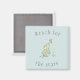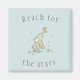 Um coelhinho pequeno recebe ajuda do amigo elefante enquanto eles alcançam as estrelas. Ilustração desenhada à mão branca com texto na fonte da cinza sobre fundo azul claro.