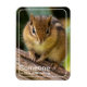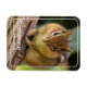 Um pedaço bonito olha com atenção para a câmera de um galho de árvore caído.