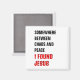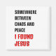 Na moda, ímã cristão minimalista com texto inspiracional lendo em ALGUM LUGAR ENTRE O CAOS E A PAZ, ENCONTREI JESUS em negros e vermelhos tipografia, presentes de correspondência disponíveis.